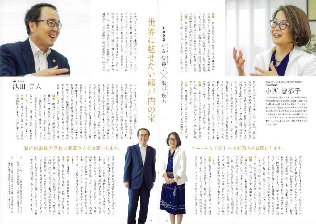 香川県知事との紙面対談「世界に魅せたい瀬戸内の宝」 「世界に魅せたい瀬戸内の宝」をテーマに、瀬戸内の島々が持つ本来の魅力と、これからの観光の在り方について、香川県知事と代表の小西の対談が掲載されています。